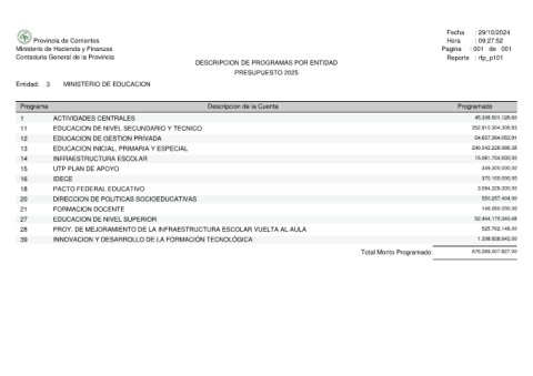 Provincia de Corrientes Ministerio de Hacienda y Finanzas Contaduria General de la Provincia MINISTERIO DE EDUCACION 3 Entidad: Programa ACTIVIDADES CENTRALES 1 EDUCACION DE NIVEL SECUNDARIO Y TECNICO 11 EDUCACION DE GESTION PRIVADA 12 EDUCACION INICIAL, PRIMARIA Y ESPECIAL 13 INFRAESTRUCTURA ESCOLAR 14 UTP PLAN DE APOYO 15 IDECE 16 PACTO FEDERAL EDUCATIVO 18 DIRECCION DE POLITICAS SOCIOEDUCATIVAS 20 FORMACION DOCENTE 21 EDUCACION DE NIVEL