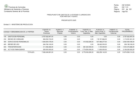 Provincia de Corrientes Ministerio de Hacienda y Finanzas Contaduria General de la Provincia Entidad: 5 - MINISTERIO DE PRODUCCION CODIGO Y DENOMINACION DE LA PARTIDA GASTOS EN PERSONAL 100 BIENES DE CONSUMO 200 SERVICIOS NO PERSONALES 300 BIENES DE USO 400 TRANSFERENCIAS 500 ACTIVOS FINANCIEROS 600
