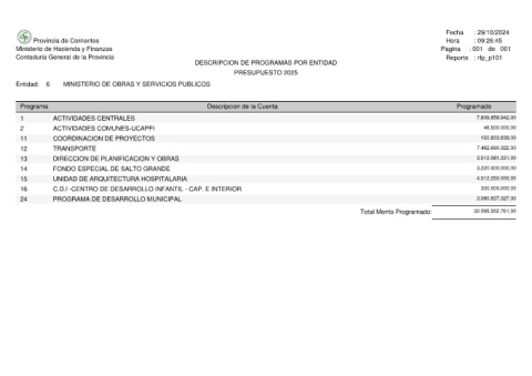 Provincia de Corrientes Ministerio de Hacienda y Finanzas Contaduria General de la Provincia MINISTERIO DE OBRAS Y SERVICIOS PUBLICOS 6 Entidad: Programa ACTIVIDADES CENTRALES 1 ACTIVIDADES COMUNES-UCAPFI 2 COORDINACION DE PROYECTOS 11 TRANSPORTE 12 DIRECCION DE PLANIFICACION Y OBRAS 13 FONDO ESPECIAL DE SALTO GRANDE 14 UNIDAD DE ARQUITECTURA HOSPITALARIA 15 C.D.I -CENTRO DE DESARROLLO INFANTIL - CAP. E INTERIOR 16 PROGRAMA DE DESARROLLO MUNICI