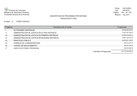 Provincia de Corrientes Ministerio de Hacienda y Finanzas Contaduria General de la Provincia PODER JUDICIAL 9 Entidad: Programa ACTIVIDADES CENTRALES 1 ADMINISTRACION DE JUSTICIA EN ULTIMA INSTANCIA 11 ADMINISTRACION DE JUSTICIA EN PRIMERA INSTANCIA 12 ADMINISTRACION DE JUSTICIA EN SEGUNDA INSTANCIA 13 MINISTERIO PUBLICO 14 CONSEJO DE LA MAGISTRATURA 15 JURADO DE ENJUICIAMIENTO 16 JUNTA ELECTORAL PROVINCIAL 17