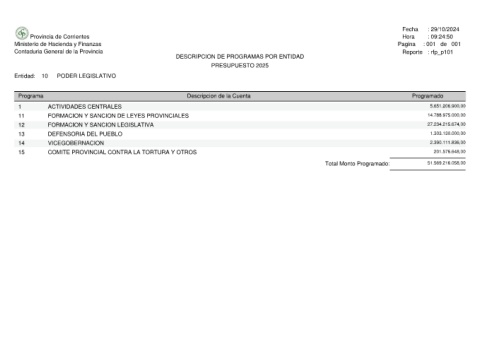 Provincia de Corrientes Ministerio de Hacienda y Finanzas Contaduria General de la Provincia PODER LEGISLATIVO 10 Entidad: Programa ACTIVIDADES CENTRALES 1 FORMACION Y SANCION DE LEYES PROVINCIALES 11 FORMACION Y SANCION LEGISLATIVA 12 DEFENSORIA DEL PUEBLO 13 VICEGOBERNACION 14 COMITE PROVINCIAL CONTRA LA TORTURA Y OTROS 15
