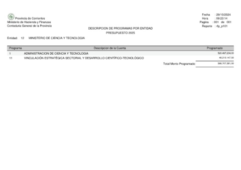 Provincia de Corrientes Ministerio de Hacienda y Finanzas Contaduria General de la Provincia MINISTERIO DE CIENCIA Y TECNOLOGIA 12 Entidad: Programa ADMINISTRACION DE CIENCIA Y TECNOLOGIA 1 11