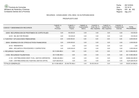 Provincia de Corrientes Ministerio de Hacienda y Finanzas Contaduria General de la Provincia CODIGO Y DENOMINACION RECURSOS 33000 RECUPERACION DE PRESTAMOS DE CORTO PLAZO 33100 - DEL SECTOR PRIVADO 3 FUENTES Y APLICACIONES FINANCIERAS 35000 DISMINUCION DE OTROS ACTIVOS FINANCIEROS 35100 - REMANENTES 35500 - ADELANTOS A PROVEEDORES Y CONTRATISTAS 4 RECURSOS FIGURATIVOS 41000 RECURSOS FIGURATIVOS 41100 - CONTRIBUCIONES ADM.P. PCIAL. GASTOS CORRIENTES 4120