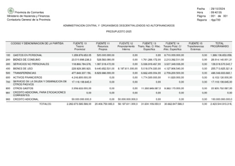Provincia de Corrientes Ministerio de Hacienda y Finanzas Contaduria General de la Provincia CODIGO Y DENOMINACION DE LA PARTIDA GASTOS EN PERSONAL 100 BIENES DE CONSUMO 200 SERVICIOS NO PERSONALES 300 BIENES DE USO 400 TRANSFERENCIAS 500 ACTIVOS FINANCIEROS 600 SERVICIO DE LA DEUDA Y DISMINUCION DE 700 OTROS PASIVOS OTROS GASTOS 800 CREDITO ADICIONAL PARA EROGACIONES 991 CORRIENTES CREDITO ADICIONAL 993 TOTALES: