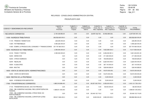 Provincia de Corrientes Ministerio de Hacienda y Finanzas Contaduria General de la Provincia CODIGO Y DENOMINACION RECURSOS 1 RECURSOS CORRIENTES 11000 INGRESOS TRIBUTARIOS 11100 - PREMIOS Y BENEFICIOS 11200 - PATRIMONIALES 11600 - SOBRE LA PRODUCCION, CONSUMO Y TRANSACCIONES 12000 INGRESOS NO TRIBUTARIOS 12100 - TASAS Y TARIFAS 12200 - DERECHOS 12300 - OTROS INGRESOS 12400 - REGALIAS 12500 - ALQUILERES 12600 - MULTAS 14000 VENTA DE BIENES SERV.
