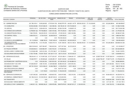 Provincia de Corrientes Ministerio de Hacienda y Finanzas Contaduria General de la Provincia FINALIDAD - FUNCION 100 - ADMINISTRACION 101 LEGISLATIVA 102 JUDICIAL 103 CONDUCCION SUPERIOR 104 ADMINISTRACION FISCAL 105 CONTROL FISCAL 106 CULTO 107 APOYO A LOS GOBIERNOS 108 ADMINISTRACION GUBERNAMENTAL SIN DISCRIMINAR 200 - SEGURIDAD 201 POLICIA INTERIOR 202 RECLUSION Y CORRECCION 203 SEGURIDAD SIN DISCRIMINAR 300 - SERVICIOS SOCIALES 301 SALUD 302 PROM