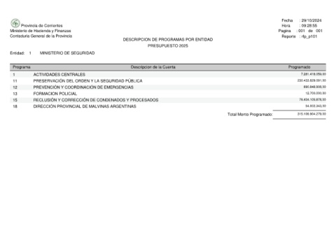 Provincia de Corrientes Ministerio de Hacienda y Finanzas Contaduria General de la Provincia MINISTERIO DE SEGURIDAD 1 Entidad: Programa ACTIVIDADES CENTRALES 1 PRESERVACIÓN DEL ORDEN Y LA SEGURIDAD PÚBLICA 11 PREVENCIÓN Y COORDINACIÓN DE EMERGENCIAS 12 FORMACION POLICIAL 13 RECLUSIÓN Y CORRECCIÓN DE CONDENADOS Y PROCESADOS 15 DIRECCIÓN PROVINCIAL DE MALVINAS ARGENTINAS 18