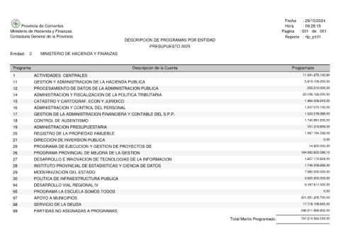 Provincia de Corrientes Ministerio de Hacienda y Finanzas Contaduria General de la Provincia MINISTERIO DE HACIENDA Y FINANZAS 2 Entidad: Programa ACTIVIDADES CENTRALES 1 GESTION Y ADMINISTRACION DE LA HACIENDA PUBLICA 11 PROCESAMIENTO DE DATOS DE LA ADMINISTRACION PUBLICA 12 ADMINISTRACION Y FISCALIZACION DE LA POLITICA TRIBUTARIA 14 CATASTRO Y CARTOGRAF. ECON Y JURIDICO 15 ADMINISTRACION Y CONTROL DEL PERSONAL 16 GESTION DE LA ADMINISTRACION FIN