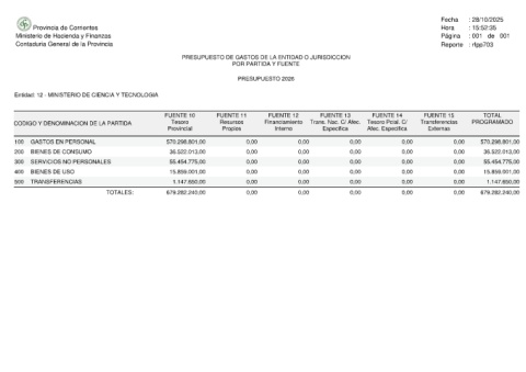 Provincia de Corrientes Ministerio de Hacienda y Finanzas Contaduria General de la Provincia Entidad: 12 - MINISTERIO DE CIENCIA Y TECNOLOGIA CODIGO Y DENOMINACION DE LA PARTIDA GASTOS EN PERSONAL 100 BIENES DE CONSUMO 200 SERVICIOS NO PERSONALES 300 BIENES DE USO 400 TRANSFERENCIAS 500