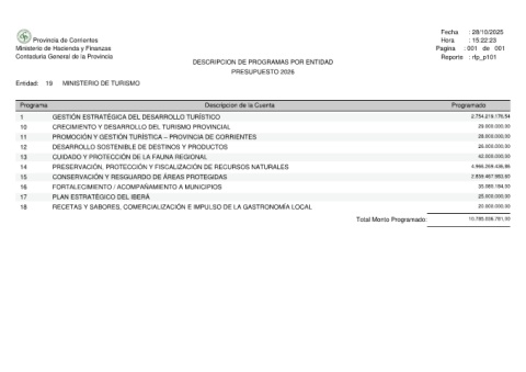 Provincia de Corrientes Ministerio de Hacienda y Finanzas Contaduria General de la Provincia MINISTERIO DE TURISMO 19 Entidad: Programa GESTIÓN ESTRATÉGICA DEL DESARROLLO TURÍSTICO 1 CRECIMIENTO Y DESARROLLO DEL TURISMO PROVINCIAL 10 PROMOCIÓN Y GESTIÓN TURÍSTICA – PROVINCIA DE CORRIENTES 11 DESARROLLO SOSTENIBLE DE DESTINOS Y PRODUCTOS 12 CUIDADO Y PROTECCIÓN DE LA FAUNA REGIONAL 13 14 CONSERVACIÓN Y RESGUARDO DE ÁREAS PROTEGIDAS 15 FORTALECIMIEN