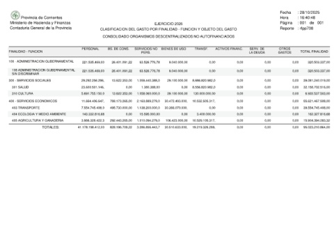 Provincia de Corrientes Ministerio de Hacienda y Finanzas Contaduria General de la Provincia FINALIDAD - FUNCION 100 - ADMINISTRACION GUBERNAMENTAL 108 ADMINISTRACION GUBERNAMENTAL SIN DISCRIMINAR 300 - SERVICIOS SOCIALES 301 SALUD 310 CULTURA 400 - SERVICIOS ECONOMICOS 403 TRANSPORTE 404 ECOLOGIA Y MEDIO AMBIENTE 405 AGRICULTURA Y GANADERIA TOTALES: