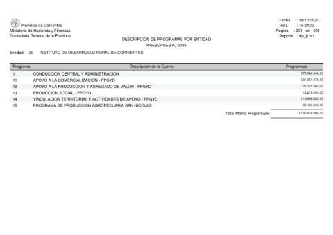 Provincia de Corrientes Ministerio de Hacienda y Finanzas Contaduria General de la Provincia INSTITUTO DE DESARROLLO RURAL DE CORRIENTES 30 Entidad: Programa CONDUCCION CENTRAL Y ADMINISTRACION 1 APOYO A LA COMERCIALIZACION - PPGYD 11 APOYO A LA PRODUCCION Y AGREGADO DE VALOR - PPGYD 12 PROMOCION SOCIAL - PPGYD 13 VINCULACION TERRITORIAL Y ACTIVIDADES DE APOYO - PPGYD 14 PROGRAMA DE PRODUCCION AGROPECUARIA SAN NICOLAS 15