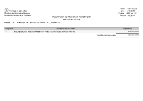 Provincia de Corrientes Ministerio de Hacienda y Finanzas Contaduria General de la Provincia ADMINIST. DE OBRAS SANITARIAS DE CORRIENTES 29 Entidad: Programa FISCALIZACION, ASESORAMIENTO Y PRESTACION DE SERVICIOS PPGYD 11