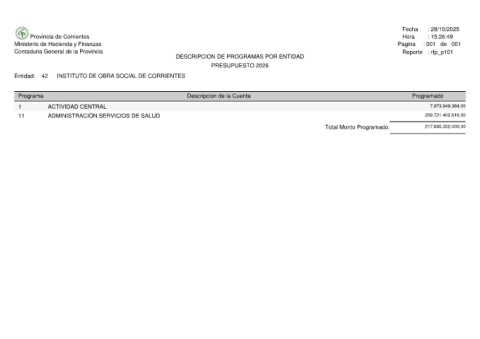 Provincia de Corrientes Ministerio de Hacienda y Finanzas Contaduria General de la Provincia INSTITUTO DE OBRA SOCIAL DE CORRIENTES 42 Entidad: Programa ACTIVIDAD CENTRAL 1 ADMINISTRACIÓN SERVICIOS DE SALUD 11