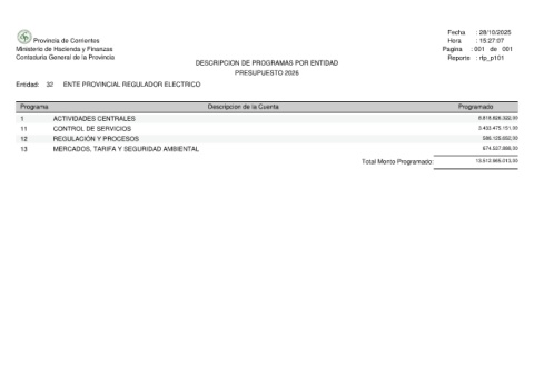 Provincia de Corrientes Ministerio de Hacienda y Finanzas Contaduria General de la Provincia ENTE PROVINCIAL REGULADOR ELECTRICO 32 Entidad: Programa ACTIVIDADES CENTRALES 1 CONTROL DE SERVICIOS 11 REGULACIÓN Y PROCESOS 12 MERCADOS, TARIFA Y SEGURIDAD AMBIENTAL 13