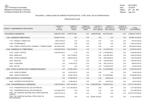 Provincia de Corrientes Ministerio de Hacienda y Finanzas Contaduria General de la Provincia CODIGO Y DENOMINACION RECURSOS 1 RECURSOS CORRIENTES 11000 INGRESOS TRIBUTARIOS 11100 - PREMIOS Y BENEFICIOS 11200 - PATRIMONIALES 11600 - SOBRE LA PRODUCCION, CONSUMO Y TRANSACCIONES 12000 INGRESOS NO TRIBUTARIOS 12100 - TASAS Y TARIFAS 12200 - DERECHOS 12300 - OTROS INGRESOS 12400 - REGALIAS 12500 - ALQUILERES 12600 - MULTAS 14000 VENTA DE BIENES SERV.