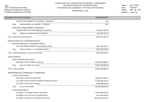 Provincia de Corrientes Ministerio de Hacienda y Finanzas Contaduria General de la Provincia Clasificación Económica de Gasto 2132100 Total: DERECHOS SOBRE BIENES INTANGIBLES 2133100 Total: TOTAL RENTAS DE LA PROPIEDAD PRESTACIONES DE LA SEGURIDAD SOCIAL 2141100 Total: TOTAL PRESTACIONES DE LA SEGURIDAD SOCIAL OTROS GASTOS GASTOS COBERTURA SALUD 2162100 Total: TOTAL OTROS GASTOS TRANSFERENCIAS CORRIENTES Y FIGURATIVAS AL SECTOR PRIVADO 2171100