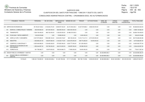 Provincia de Corrientes Ministerio de Hacienda y Finanzas Contaduria General de la Provincia FINALIDAD - FUNCION 400 - SERVICIOS ECONOMICOS ENERGIA, COMBUSTIBLES Y MINERIA 401 TRANSPORTE 403 ECOLOGIA Y MEDIO AMBIENTE 404 AGRICULTURA Y GANADERIA 405 INDUSTRIA 406 COMERCIO, ALMACENAJE Y 407 SERVICIOS ECONOMICOS SIN 409 DISCRIMINAR FORESTALES 410 500 - DEUDA PUBLICA, INTERESES Y GASTOS DEUDA PUBLICA. INTERESES Y 501 GASTOS TOTALES: