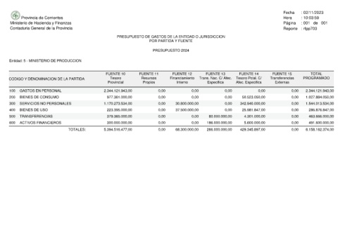 Provincia de Corrientes Ministerio de Hacienda y Finanzas Contaduria General de la Provincia Entidad: 5 - MINISTERIO DE PRODUCCION CODIGO Y DENOMINACION DE LA PARTIDA GASTOS EN PERSONAL 100 BIENES DE CONSUMO 200 SERVICIOS NO PERSONALES 300 BIENES DE USO 400 TRANSFERENCIAS 500 ACTIVOS FINANCIEROS 600