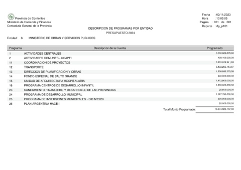 Provincia de Corrientes Ministerio de Hacienda y Finanzas Contaduria General de la Provincia MINISTERIO DE OBRAS Y SERVICIOS PUBLICOS 6 Entidad: Programa ACTIVIDADES CENTRALES 1 ACTIVIDADES COMUNES - UCAPFI 2 COORDINACION DE PROYECTOS 11 TRANSPORTE 12 DIRECCION DE PLANIFICACION Y OBRAS 13 FONDO ESPECIAL DE SALTO GRANDE 14 UNIDAD DE ARQUITECTURA HOSPITALARIA 15 PROGRAMA CENTROS DE DESARROLLO INFANTIL 16 SANEAMIENTO FINANCIERO Y DESARROLLO DE LAS