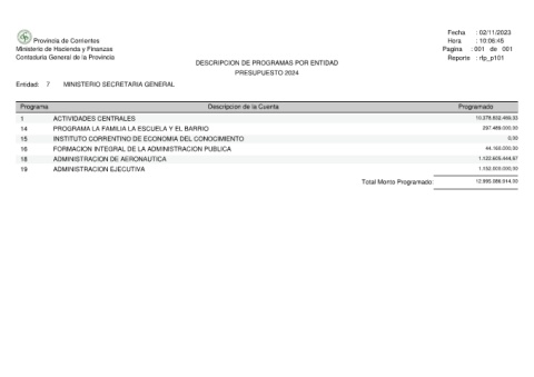Provincia de Corrientes Ministerio de Hacienda y Finanzas Contaduria General de la Provincia MINISTERIO SECRETARIA GENERAL 7 Entidad: Programa ACTIVIDADES CENTRALES 1 PROGRAMA LA FAMILIA LA ESCUELA Y EL BARRIO 14 INSTITUTO CORRENTINO DE ECONOMIA DEL CONOCIMIENTO 15 FORMACION INTEGRAL DE LA ADMINISTRACION PUBLICA 16 ADMINISTRACION DE AERONAUTICA 18 ADMINISTRACION EJECUTIVA 19