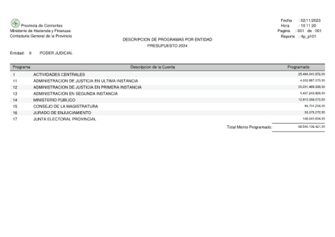 Provincia de Corrientes Ministerio de Hacienda y Finanzas Contaduria General de la Provincia PODER JUDICIAL 9 Entidad: Programa ACTIVIDADES CENTRALES 1 ADMINISTRACION DE JUSTICIA EN ULTIMA INSTANCIA 11 ADMINISTRACION DE JUSTICIA EN PRIMERA INSTANCIA 12 ADMINISTRACION EN SEGUNDA INSTANCIA 13 MINISTERIO PUBLICO 14 CONSEJO DE LA MAGISTRATURA 15 JURADO DE ENJUICIAMIENTO 16 JUNTA ELECTORAL PROVINCIAL 17