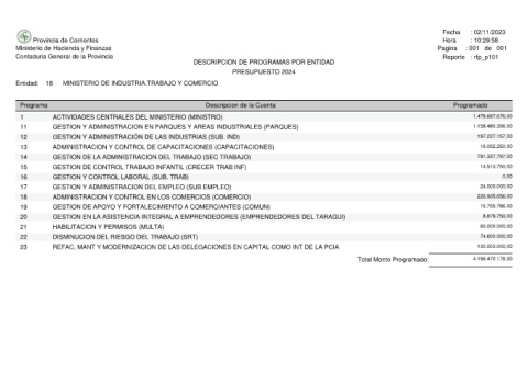 Provincia de Corrientes Ministerio de Hacienda y Finanzas Contaduria General de la Provincia MINISTERIO DE INDUSTRIA,TRABAJO Y COMERCIO 18 Entidad: Programa ACTIVIDADES CENTRALES DEL MINISTERIO (MINISTRO) 1 11 GESTION Y ADMINISTRACIÓN DE LAS INDUSTRIAS (SUB. IND) 12 ADMINISTRACION Y CONTROL DE CAPACITACIONES (CAPACITACIONES) 13 GESTION DE LA ADMINISTRACION DEL TRABAJO (SEC TRABAJO) 14 GESTION DE CONTROL TRABAJO INFANTIL (CRECER TRAB INF) 15 GESTION