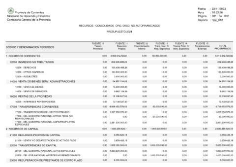 Provincia de Corrientes Ministerio de Hacienda y Finanzas Contaduria General de la Provincia CODIGO Y DENOMINACION RECURSOS 1 RECURSOS CORRIENTES 12000 INGRESOS NO TRIBUTARIOS 12200 - DERECHOS 12300 - OTROS INGRESOS 12500 - ALQUILERES 14000 VENTA DE BIENES SERV. ADMINISTRACIONES 14100 - VENTA DE BIENES 14200 - VENTA DE SERVICIOS 16000 RENTAS DE LA PROPIEDAD 16200 - INTERESES POR DEPOSITOS 17000 TRANSFERENCIAS CORRIENTES 17100 - TRANSFERENCIAS DEL SEC