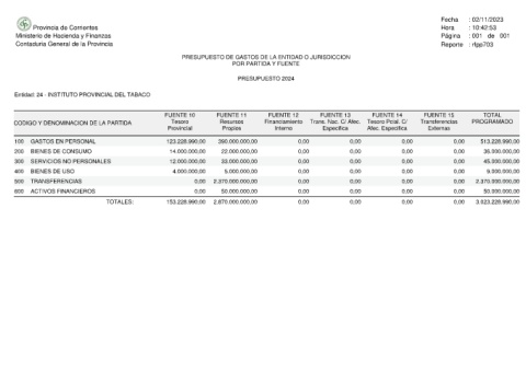 Provincia de Corrientes Ministerio de Hacienda y Finanzas Contaduria General de la Provincia Entidad: 24 - INSTITUTO PROVINCIAL DEL TABACO CODIGO Y DENOMINACION DE LA PARTIDA GASTOS EN PERSONAL 100 BIENES DE CONSUMO 200 SERVICIOS NO PERSONALES 300 BIENES DE USO 400 TRANSFERENCIAS 500 ACTIVOS FINANCIEROS 600