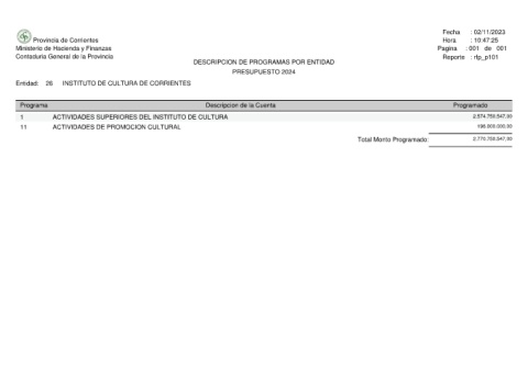 Provincia de Corrientes Ministerio de Hacienda y Finanzas Contaduria General de la Provincia INSTITUTO DE CULTURA DE CORRIENTES 26 Entidad: Programa ACTIVIDADES SUPERIORES DEL INSTITUTO DE CULTURA 1 ACTIVIDADES DE PROMOCION CULTURAL 11