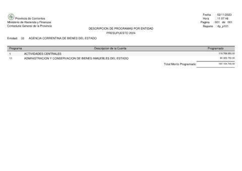 Provincia de Corrientes Ministerio de Hacienda y Finanzas Contaduria General de la Provincia AGENCIA CORRENTINA DE BIENES DEL ESTADO 33 Entidad: Programa ACTIVIDADES CENTRALES 1 11