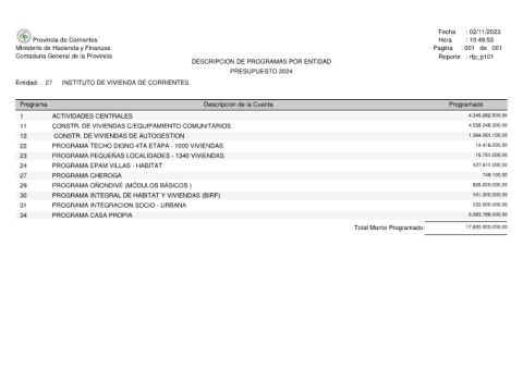 Provincia de Corrientes Ministerio de Hacienda y Finanzas Contaduria General de la Provincia INSTITUTO DE VIVIENDA DE CORRIENTES 27 Entidad: Programa ACTIVIDADES CENTRALES 1 CONSTR. DE VIVIENDAS C/EQUIPAMIENTO COMUNITARIOS 11 CONSTR. DE VIVIENDAS DE AUTOGESTION 12 PROGRAMA TECHO DIGNO 4TA ETAPA - 1000 VIVIENDAS 22 PROGRAMA PEQUEÑAS LOCALIDADES - 1340 VIVIENDAS 23 PROGRAMA EPAM VILLAS - HABITAT 24 PROGRAMA CHEROGA 27 PROGRAMA OÑONDIVÉ (MÓDULOS B