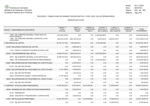 Provincia de Corrientes Ministerio de Hacienda y Finanzas Contaduria General de la Provincia CODIGO Y DENOMINACION RECURSOS 17800 - DEL GOBIERNO NACIONAL OTROS FDOS. NO REINTEGRABLES 17900 - DEL GOBIERNO NACIONAL.COPARTICIP.LEYES ESPECIALES 2 RECURSOS DE CAPITAL 21000 RECURSOS PROPIOS DE CAPITAL 21100 - VENTA Y/O DESAFECTACION DE ACTIVOS FIJOS 22000 TRANSFERENCIAS DE CAPITAL 22700 - DEL GOBIERNO NACIONAL-LEYES ESPECIALES 22800 - DEL GOB.NACIONAL-APORTES N