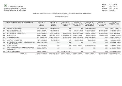 Provincia de Corrientes Ministerio de Hacienda y Finanzas Contaduria General de la Provincia CODIGO Y DENOMINACION DE LA PARTIDA GASTOS EN PERSONAL 100 BIENES DE CONSUMO 200 SERVICIOS NO PERSONALES 300 BIENES DE USO 400 TRANSFERENCIAS 500 ACTIVOS FINANCIEROS 600 SERVICIO DE LA DEUDA Y DISMINUCION DE 700 OTROS PASIVOS OTROS GASTOS 800 CREDITO ADICIONAL PARA EROGACIONES 991 CORRIENTES CREDITO ADICIONAL 993 TOTALES: