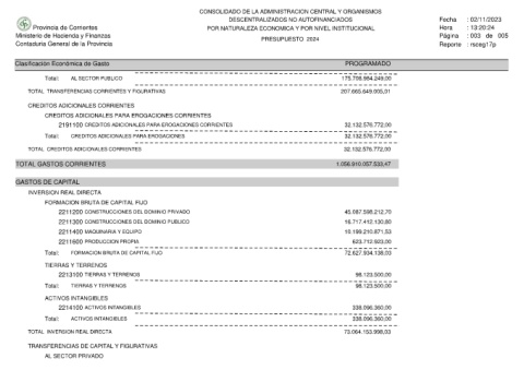 Provincia de Corrientes Ministerio de Hacienda y Finanzas Contaduria General de la Provincia Clasificación Económica de Gasto AL SECTOR PUBLICO Total: TOTAL TRANSFERENCIAS CORRIENTES Y FIGURATIVAS CREDITOS ADICIONALES CORRIENTES CREDITOS ADICIONALES PARA EROGACIONES CORRIENTES CREDITOS ADICIONALES PARA EROGACIONES CORRIENTES 2191100 CREDITOS ADICIONALES PARA EROGACIONES Total: TOTAL CREDITOS ADICIONALES CORRIENTES TOTAL GASTOS CORRIENTES GASTOS DE CAPIT