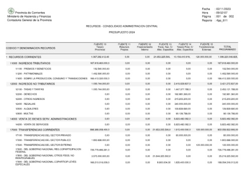 Provincia de Corrientes Ministerio de Hacienda y Finanzas Contaduria General de la Provincia CODIGO Y DENOMINACION RECURSOS 1 RECURSOS CORRIENTES 11000 INGRESOS TRIBUTARIOS 11100 - PREMIOS Y BENEFICIOS 11200 - PATRIMONIALES 11600 - SOBRE LA PRODUCCION, CONSUMO Y TRANSACCIONES 12000 INGRESOS NO TRIBUTARIOS 12100 - TASAS Y TARIFAS 12200 - DERECHOS 12300 - OTROS INGRESOS 12400 - REGALIAS 12500 - ALQUILERES 12600 - MULTAS 14000 VENTA DE BIENES SERV.