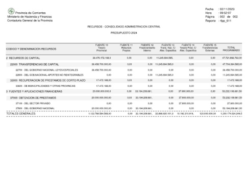 Provincia de Corrientes Ministerio de Hacienda y Finanzas Contaduria General de la Provincia CODIGO Y DENOMINACION RECURSOS 2 RECURSOS DE CAPITAL 22000 TRANSFERENCIAS DE CAPITAL 22700 - DEL GOBIERNO NACIONAL-LEYES ESPECIALES 22800 - DEL GOB.NACIONAL-APORTES NO REINTEGRABLES 33000 RECUPERACION DE PRESTAMOS DE CORTO PLAZO 33600 - DE MUNICIPALIDADES Y OTRAS PROVINCIAS 3 FUENTES Y APLICACIONES FINANCIERAS 37000 OBTENCION DE PRESTAMOS 37100 - DEL SECTOR PRIV