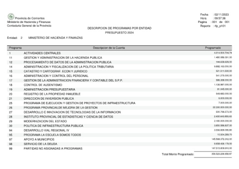 Provincia de Corrientes Ministerio de Hacienda y Finanzas Contaduria General de la Provincia MINISTERIO DE HACIENDA Y FINANZAS 2 Entidad: Programa ACTIVIDADES CENTRALES 1 GESTION Y ADMINISTRACION DE LA HACIENDA PUBLICA 11 PROCESAMIENTO DE DATOS DE LA ADMINISTRACION PUBLICA 12 ADMINSITRACION Y FISCALIZACION DE LA POLITICA TRIBUTARIA 14 CATASTRO Y CARTOGRAF. ECON Y JURIDICO 15 ADMINISTRACION Y CONTROL DEL PERSONAL 16 GESTION DE LA ADMINISTRACION FIN