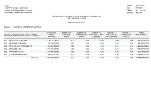 Provincia de Corrientes Ministerio de Hacienda y Finanzas Contaduria General de la Provincia Entidad: 7 - MINISTERIO SECRETARIA GENERAL CODIGO Y DENOMINACION DE LA PARTIDA GASTOS EN PERSONAL 100 BIENES DE CONSUMO 200 SERVICIOS NO PERSONALES 300 BIENES DE USO 400 TRANSFERENCIAS 500 ACTIVOS FINANCIEROS 600