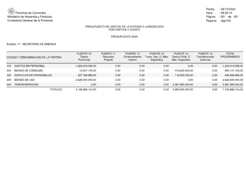 Provincia de Corrientes Ministerio de Hacienda y Finanzas Contaduria General de la Provincia Entidad: 17 - SECRETARIA DE ENERGIA CODIGO Y DENOMINACION DE LA PARTIDA GASTOS EN PERSONAL 100 BIENES DE CONSUMO 200 SERVICIOS NO PERSONALES 300 BIENES DE USO 400 TRANSFERENCIAS 500 TOTALES: