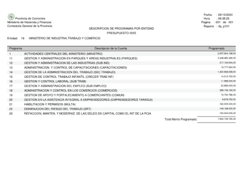 Provincia de Corrientes Ministerio de Hacienda y Finanzas Contaduria General de la Provincia MINISTERIO DE INDUSTRIA,TRABAJO Y COMERCIO 18 Entidad: Programa ACTIVIDADES CENTRALES DEL MINISTERIO (MINISTRO) 1 11 GESTION Y ADMINISTRACION DE LAS INDUSTRIAS (SUB IND) 12 ADMINISTRACION Y CONTROL DE CAPACITACIONES (CAPACITACIONES) 13 GESTION DE LA ADMINISTRACION DEL TRABAJO (SEC TRABAJO) 14 GESTION DE CONTROL TRABAJO INFANTIL (CRECER TRAB INF) 15 GESTION