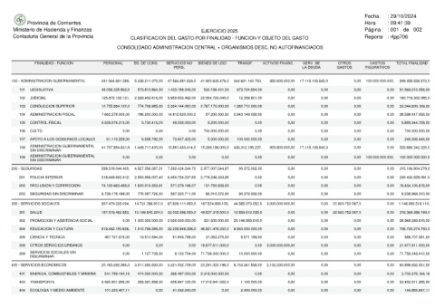 Provincia de Corrientes Ministerio de Hacienda y Finanzas Contaduria General de la Provincia FINALIDAD - FUNCION 100 - ADMINISTRACION GUBERNAMENTAL LEGISLATIVA 101 JUDICIAL 102 CONDUCCION SUPERIOR 103 ADMINISTRACION FISCAL 104 CONTROL FISCAL 105 CULTO 106 APOYO A LOS GOBIERNOS LOCALES 107 ADMINISTRACION GUBERNAMENTAL 108 SIN DISCRIMINAR ADMINISTRACION GUBERNAMENTAL 108 SIN DISCRIMINAR 200 - SEGURIDAD POLICIA INTERIOR 201 RECLUSION Y CORRECC