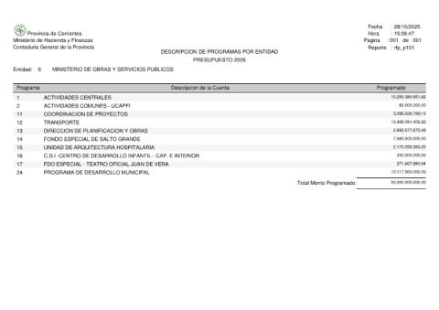 Provincia de Corrientes Ministerio de Hacienda y Finanzas Contaduria General de la Provincia MINISTERIO DE OBRAS Y SERVICIOS PUBLICOS 6 Entidad: Programa ACTIVIDADES CENTRALES 1 ACTIVIDADES COMUNES - UCAPFI 2 COORDINACION DE PROYECTOS 11 TRANSPORTE 12 DIRECCION DE PLANIFICACION Y OBRAS 13 FONDO ESPECIAL DE SALTO GRANDE 14 UNIDAD DE ARQUITECTURA HOSPITALARIA 15 C.D.I -CENTRO DE DESARROLLO INFANTIL - CAP. E INTERIOR 16 FDO ESPECIAL - TEATRO OFICI