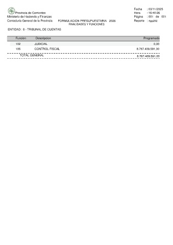 Contaduria General de la Provincia FORMULACION PRESUPUESTARIA 2026 Reporte : rfpp202