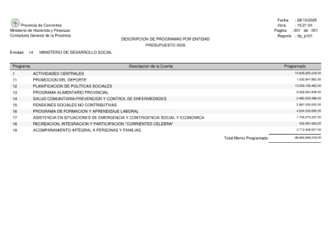 Provincia de Corrientes Ministerio de Hacienda y Finanzas Contaduria General de la Provincia MINISTERIO DE DESARROLLO SOCIAL 14 Entidad: Programa ACTIVIDADES CENTRALES 1 PROMOCION DEL DEPORTE 11 PLANIFICACION DE POLITICAS SOCIALES 12 PROGRAMA ALIMENTARIO PROVINCIAL 13 SALUD COMUNITARIA-PREVENCION Y CONTROL DE ENFERMEDADES 14 PENSIONES SOCIALES NO CONTRIBUTIVAS 15 PROGRAMA DE FORMACION Y APRENDIZAJE LABORAL 16 17 RECREACION, INTEGRACION Y PARTICI
