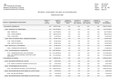 Provincia de Corrientes Ministerio de Hacienda y Finanzas Contaduria General de la Provincia CODIGO Y DENOMINACION RECURSOS 1 RECURSOS CORRIENTES 12000 INGRESOS NO TRIBUTARIOS 12200 - DERECHOS 12300 - OTROS INGRESOS 12500 - ALQUILERES 14000 VENTA DE BIENES SERV. ADMINISTRACIONES 14100 - VENTA DE BIENES 14200 - VENTA DE SERVICIOS 16000 RENTAS DE LA PROPIEDAD 16200 - INTERESES POR DEPOSITOS 17000 TRANSFERENCIAS CORRIENTES 17100 - TRANSFERENCIAS DEL SEC