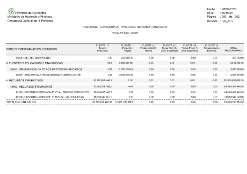 Provincia de Corrientes Ministerio de Hacienda y Finanzas Contaduria General de la Provincia CODIGO Y DENOMINACION RECURSOS 33100 - DEL SECTOR PRIVADO 3 FUENTES Y APLICACIONES FINANCIERAS 35000 DISMINUCION DE OTROS ACTIVOS FINANCIEROS 35500 - ADELANTOS A PROVEEDORES Y CONTRATISTAS 4 RECURSOS FIGURATIVOS 41000 RECURSOS FIGURATIVOS 41100 - CONTRIBUCIONES ADM.P. PCIAL. GASTOS CORRIENTES 41200 - CONTRIBUCIONES SEC.PUB.PCIAL GASTOS CAPITAL TOTALES GENERALES: