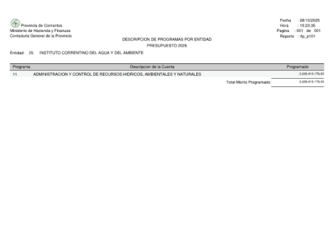 Provincia de Corrientes Ministerio de Hacienda y Finanzas Contaduria General de la Provincia INSTITUTO CORRENTINO DEL AGUA Y DEL AMBIENTE 25 Entidad: Programa 11