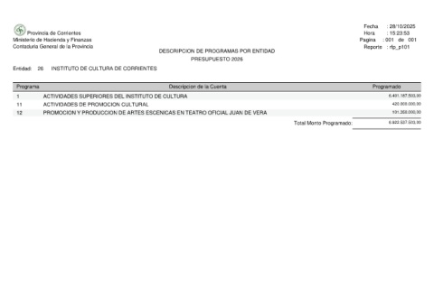 Provincia de Corrientes Ministerio de Hacienda y Finanzas Contaduria General de la Provincia INSTITUTO DE CULTURA DE CORRIENTES 26 Entidad: Programa ACTIVIDADES SUPERIORES DEL INSTITUTO DE CULTURA 1 ACTIVIDADES DE PROMOCION CULTURAL 11 12