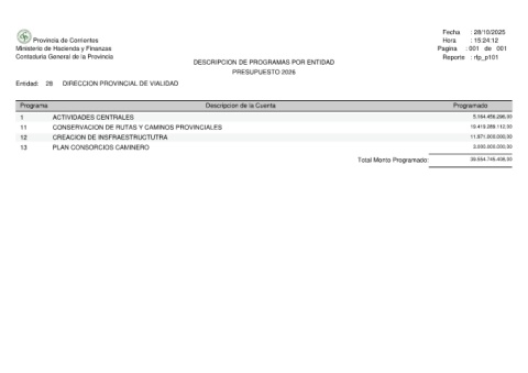 Provincia de Corrientes Ministerio de Hacienda y Finanzas Contaduria General de la Provincia DIRECCION PROVINCIAL DE VIALIDAD 28 Entidad: Programa ACTIVIDADES CENTRALES 1 CONSERVACION DE RUTAS Y CAMINOS PROVINCIALES 11 CREACION DE INSFRAESTRUCTUTRA 12 PLAN CONSORCIOS CAMINERO 13